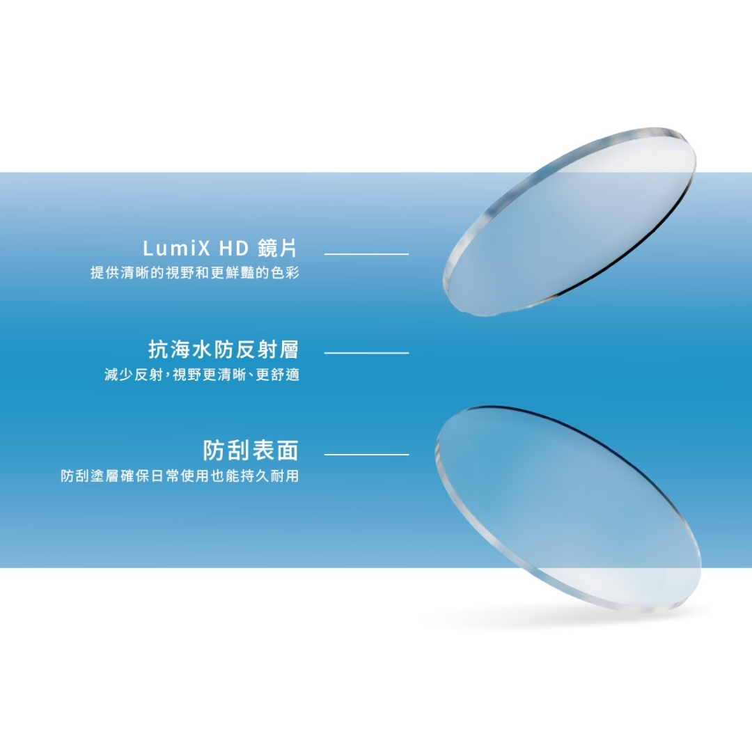 鏡片鍍膜:雙面 EYEGLAD "SeaShield" 鏡片抗海水鍍膜塗層技術 / 光學抗反射塗層