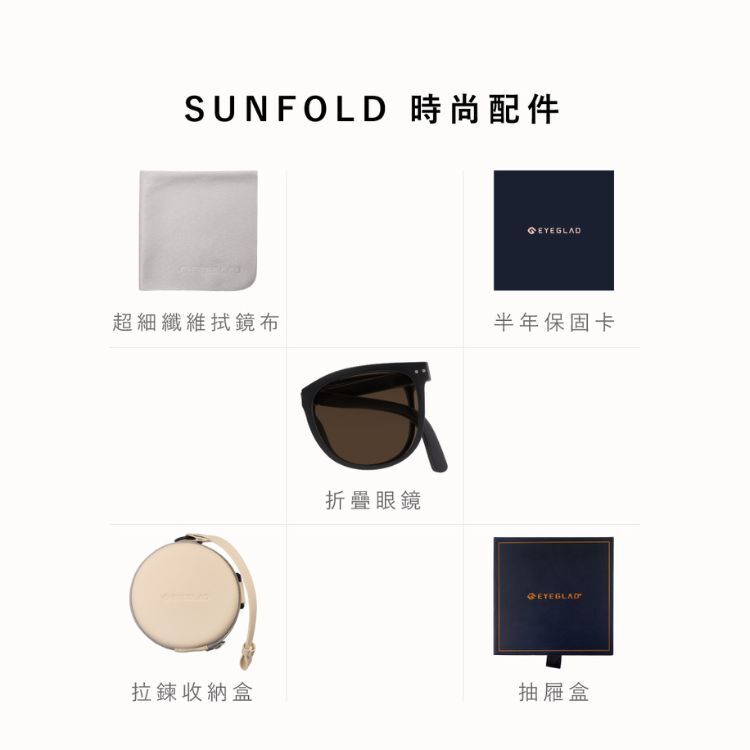 產品內容:包含折疊眼鏡一支、圓形拉鍊收納盒一個、超細纖維拭鏡布一片、保固卡及包裝盒