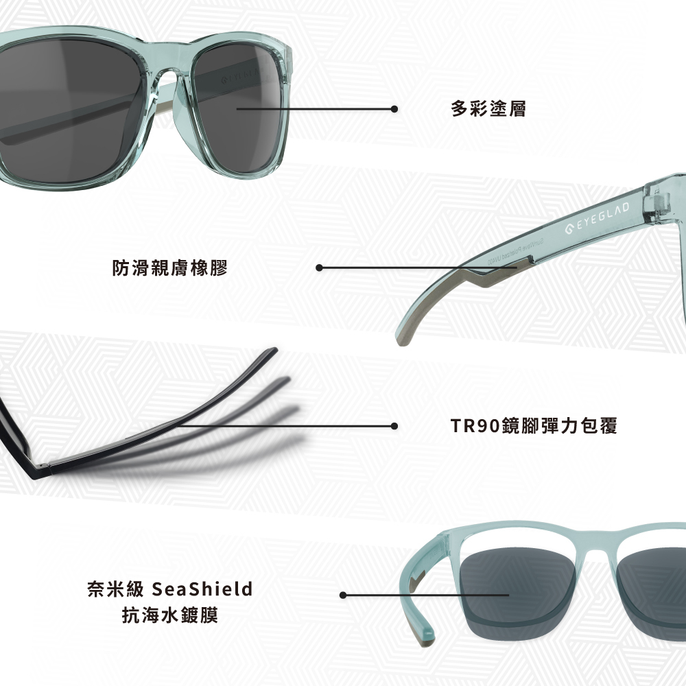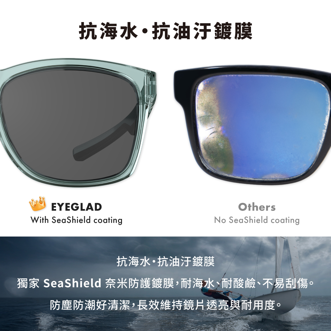 鏡片鍍膜:炫彩玫瑰金多層膜 / EYEGLAD "SeaShield" 鏡片抗海水鍍膜塗層技術