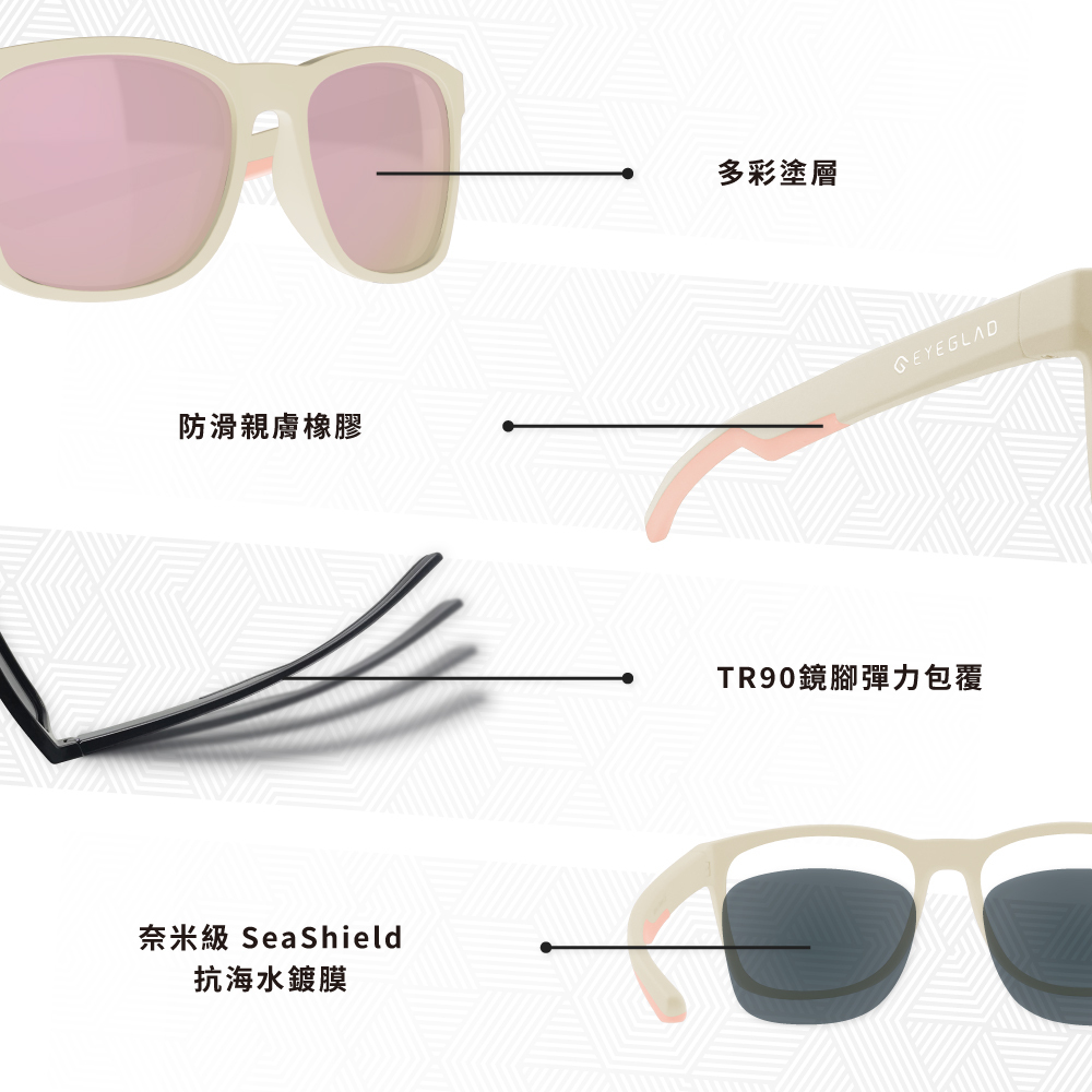 鏡片鍍膜:炫彩玫瑰金多層膜 / EYEGLAD "SeaShield" 鏡片抗海水鍍膜塗層技術